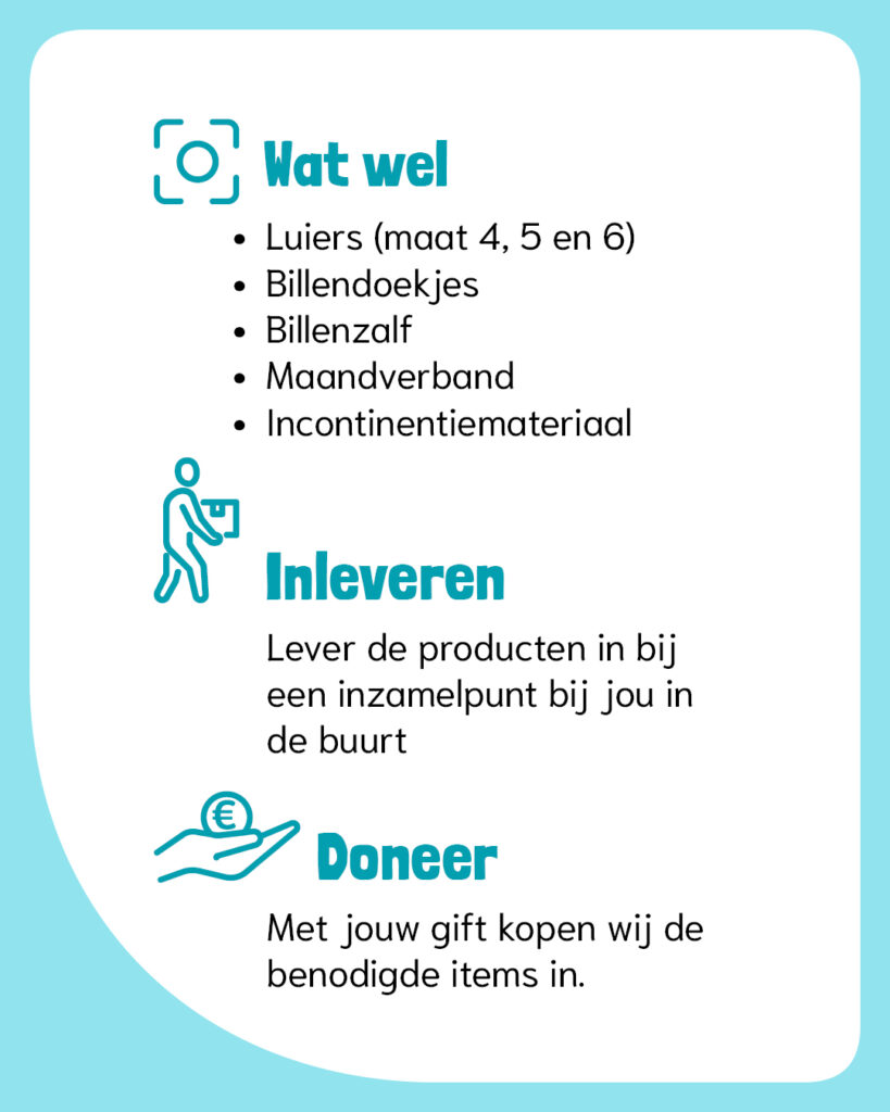 Hoe meer mensen in actie komen, hoe beter we samen kinderen en moeders op de vlucht kunnen helpen aan luiers, billendoekjes en maandverband. Door de actie met jouw netwerk te delen, kun jij bekendheid geven aan Luiers voor Lesbos 2025. Hieronder is reclamemateriaal te vinden, ontwikkeld door CRR en vrij te downloaden en gebruiken. Dus download en share! Tag @luiersvoorlesbos en @christianrefugeerelief op sociale media, zodat ook wij jullie mooie verhalen kunnen zien.